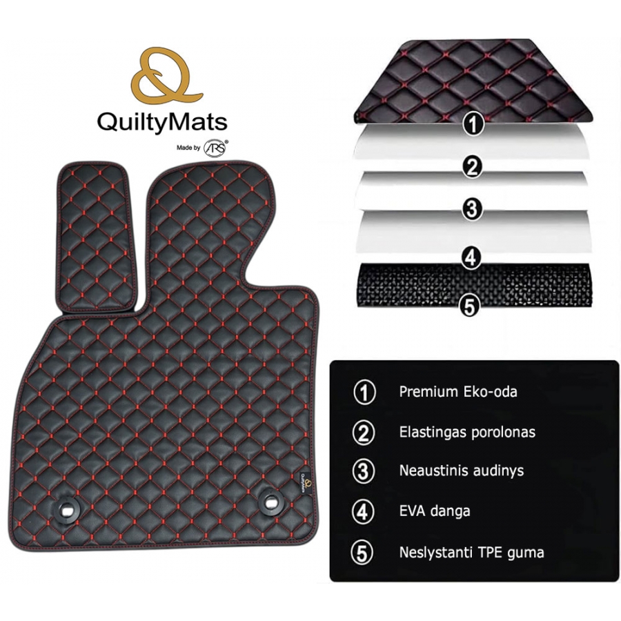„QuiltyMats“ išsiskiria tarp kitų automobilio kilimėlių savo kokybe ir tikslumu. Dygsniuotas paviršius suteikia papildomo komforto ir padeda išlaikyti tvarkingą automobilio salono vaizdą kiekvieną dieną.